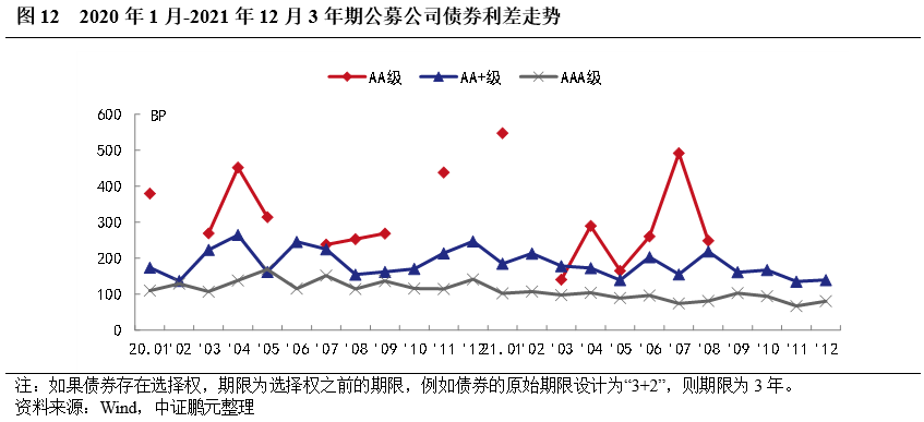綜合2021年1-12月份來看,3年期的交易所公司債券發行1,303只,累計發行規模11,065.76億元,占比分別為32%和32%;5年期的交易所公司債券發行1,760只,累計發行規模15,602.80億元,占比分別為43%和45%。分債券品種而言,1-12月份3年期和5年期公募公司債發行數量分別占比34.5%和43.9%,發行規模占比分別36%和42%;3年期私募債發行數量和發行規模分別占比31%和43%,5年期私募債發行數量和發行規模分別占比28%和48%。