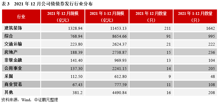 2021年12月份,交易所公司債券的發行人主要分布于建筑裝飾和綜合行業。具體來看,建筑裝飾行業發行211只,占比53%,發行規模1,329億元,占比40%,位居首位;其次是綜合行業,發行91只,占比為23%,發行規模769億元,占比23%,位于第二;交通運輸行業發行21只,占比為5%,發行規模224億元,占比7%,位于第三。1-12月整體來看,建筑裝飾、綜合和房地產行業位居前三,分別發行11,453.13億元、8,654.66億元和2,738.87億元。