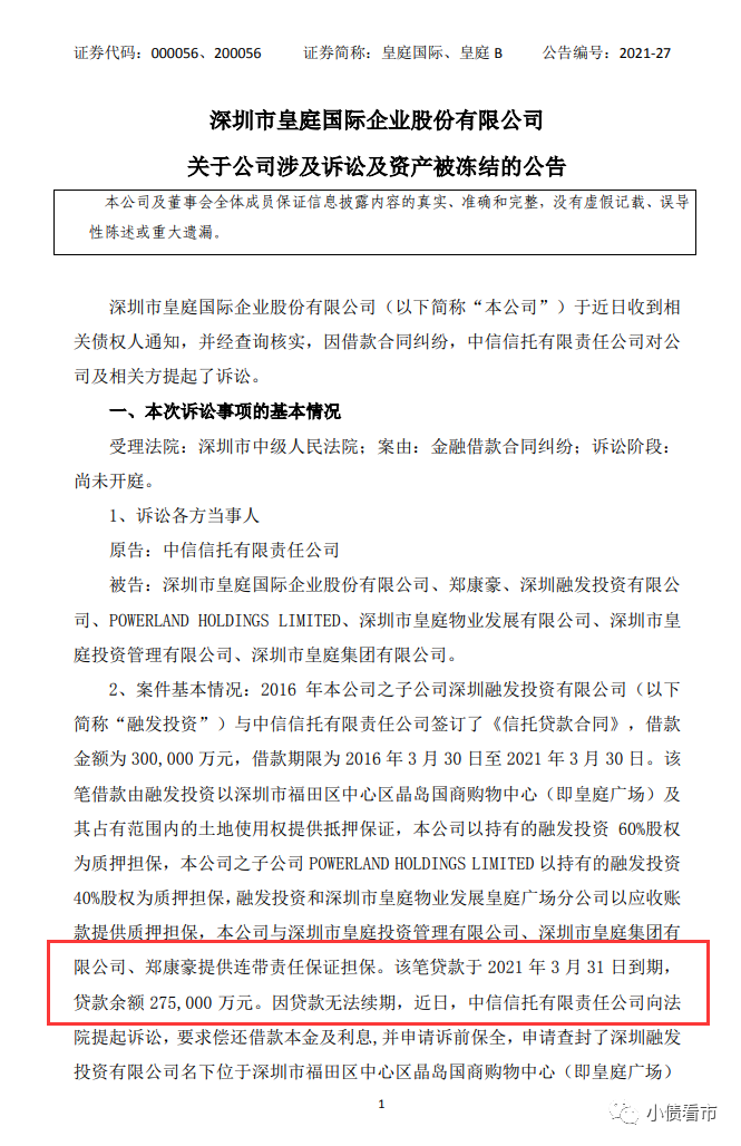 據(jù)悉,2016年皇庭國際子公司融發(fā)投資與中信信托簽訂了《信托貸款合同》,借款金額為30億元。該筆貸款已于2021年3月31日到期,貸款余額27.5億元。