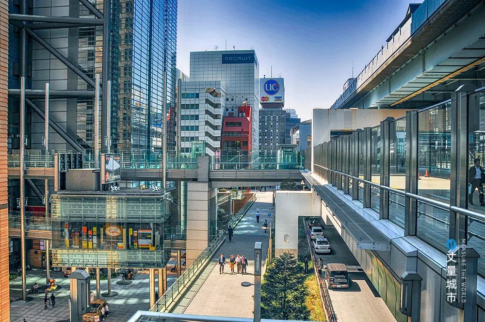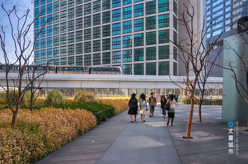 基于公共空間管理要求,聯合協會拿出了立體步行道路體系的解決方案:汐留地區寫字樓、商業、住宅、車站等多種功能高度復合,通過分層的立體交通建設,實現步行、車行、軌道交通的分別治理。