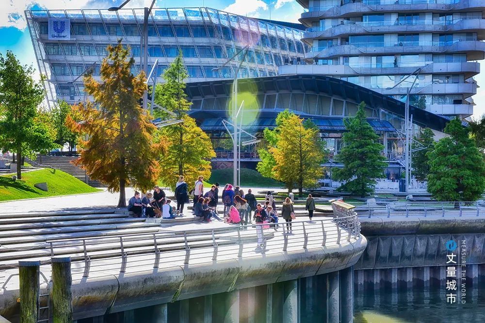 例如區域內的聯合利華總部,大樓底層并不像傳統的總部辦公那樣「與世隔絕」,居民和游客可以在此隨便穿行。大堂內還設有便利店等商業設施,室外的大臺階承擔著公共活動舉辦地的角色。