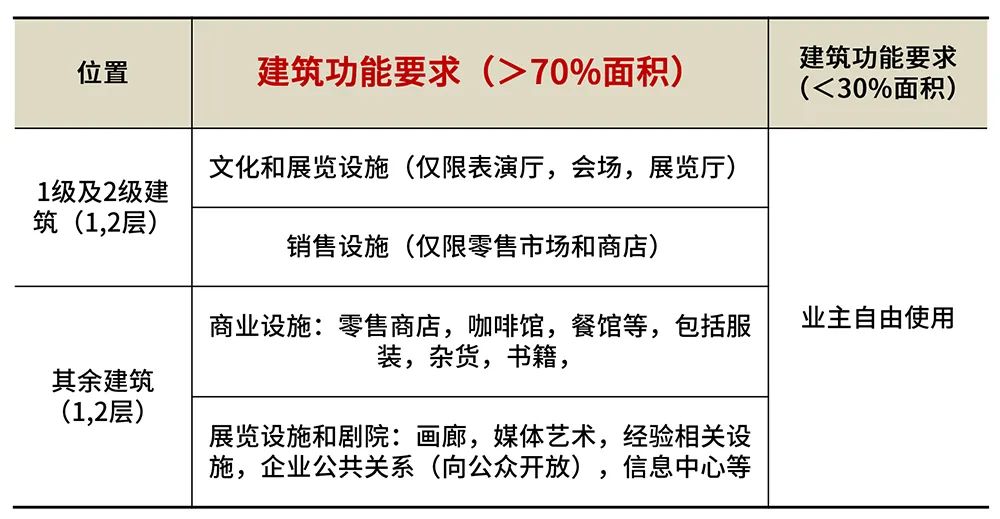 此外,企業建筑1-2層必須具備「公共職能」屬性,其中70%以上的建筑面積僅限于文化展覽、商業零售功能。