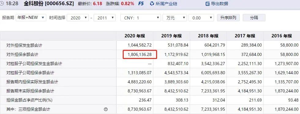 雷達財經發現,金科股份的財務附注中,2020年對外擔保余額合計180.61億元,較2019年同比增長54%。
