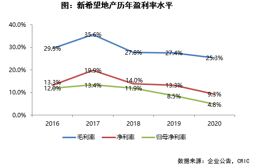 2020年新希望地產(chǎn)毛利率25.3%、凈利率9.3%、歸母凈利率4.8%,分別同比下降了2.1、4.0、3.7個(gè)百分點(diǎn)。主要在于新希望重點(diǎn)深耕一二線城市,這些城市的限價(jià)政策對(duì)新希望地產(chǎn)項(xiàng)目利潤(rùn)造成一定的擠壓,加上合作項(xiàng)目的增多,對(duì)項(xiàng)目的成本管控方面存在一定的不確定性,對(duì)利潤(rùn)率造成一定的影響。