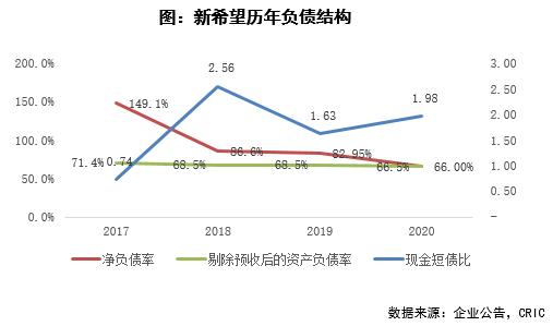 2020年新希望地產(chǎn)持續(xù)保證較高的回款率,銷售回款率達(dá)到90%,得益于此,2020年末,新希望地產(chǎn)持有現(xiàn)金150.91億元,同比上升14.2%,現(xiàn)金短債比1.98,短期內(nèi)償債壓力較小;長(zhǎng)短債比3.78,同比增長(zhǎng)0.5,債務(wù)結(jié)構(gòu)健康。