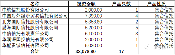 根據(jù)界面新聞的報(bào)道,“17騰邦01”債券違約之后的訴訟,泄露出13家機(jī)構(gòu)名單(報(bào)道詳見https://www.jiemian.com/article/6122466.html)。而讓債券民工很意外的是,這13家機(jī)構(gòu)名單中,共有7家信托公司,涉及了17只集合信托產(chǎn)品!債券民工根據(jù)公開信息整理了這7家信托公司在“17騰邦01”中的具體投資情況,詳見下表: