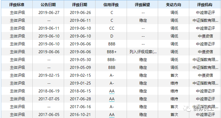 騰邦集團(tuán)有限公司的主體信用評(píng)級(jí)已經(jīng)從2016年的AA下調(diào)至C,信用評(píng)級(jí)呈現(xiàn)斷崖式下跌。