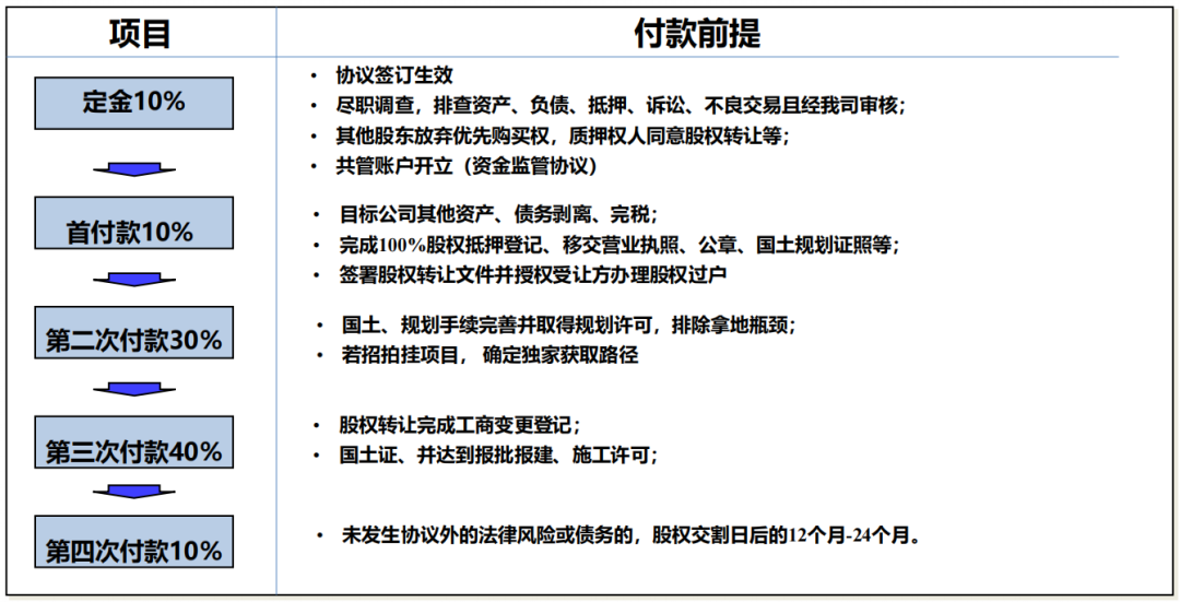 在收并購項目中,一般會將對價分多批次支付,通過共管+解付條件控制每一筆資金支出。
