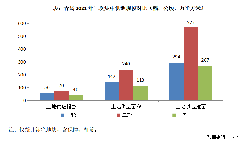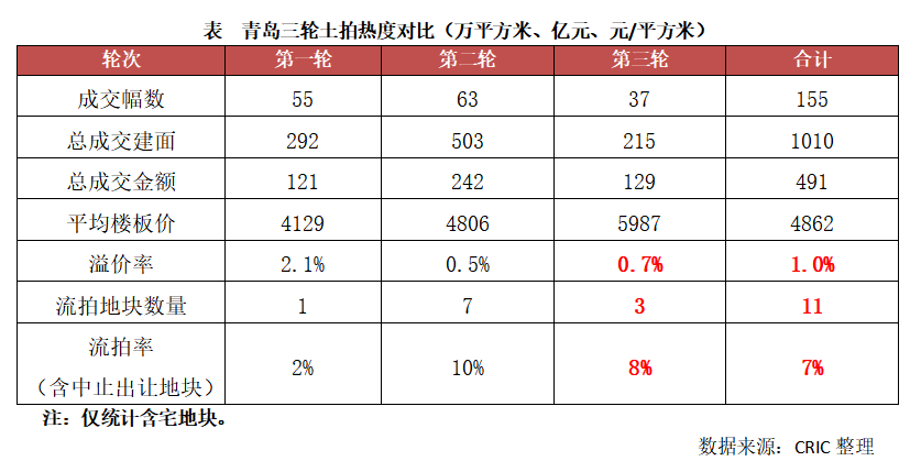 12月15日,為期三天的青島第三輪集中土拍結束,掛牌的40宗宅地中有37宗成功出讓,成交建面215萬平方米,總成交金額129億元。就熱度來看,三輪土拍熱度仍延續低位,整體溢價率僅有0.7%。