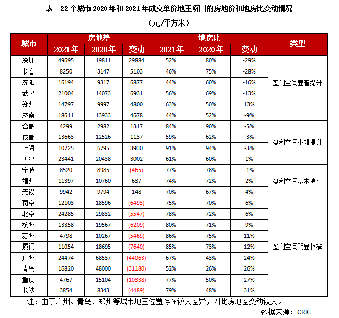 另有10個城市成交年度單價地王項目利潤空間較去年有所提升,其中,深圳、長春、沈陽、武漢、鄭州、合肥、濟南和上海的利潤空間漲幅都在30%以上,除長春和合肥外,其余城市2021年成交單價地王項目的房地價差基本均已過萬。房地價差之所以明顯上升,主要由于2021年調控政策收緊、地價水平也被列入重點監管對象,地價難創新高,因此10城中6個城市2021年單價地王的價格不敵2020年,但核心片區房價卻穩步上漲,導致房地價差被明顯拉大。