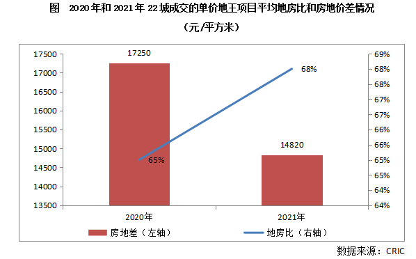 在梳理重點城市的單價地王價格變化的基礎上,我們進一步測算了這些地王的盈利情況。2020年,22個重點城市成交年度單價“地王”項目平均地房比為0.65,房地價差達17250元/平方米;而在2021年,這些城市單價“地王”項目的平均地房比增至68%,房地價差也縮窄至14820元/平方米,盈利空間明顯收窄。