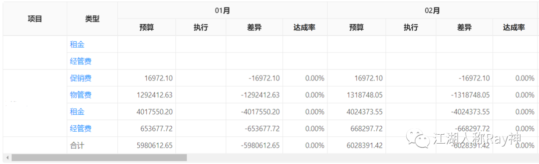一定時期的某項指標的實際完成額相比于預(yù)算目標額的百分比,即:預(yù)算達成率=實際完成額 / 預(yù)算目標額。由于預(yù)算一般按年進行考核,因此預(yù)算達成率有月度達成率和累計達成率的概念,累計預(yù)算達成率=年累計實際完成額 / 年度預(yù)算目標額。此外,運營過程中,進行預(yù)算達成率評價的指標一般包括各項收入和費用,如:租金預(yù)算達成率、費用預(yù)算使用率等,也有應(yīng)用于出租面積、商戶銷售額、客流等業(yè)務(wù)指標上。