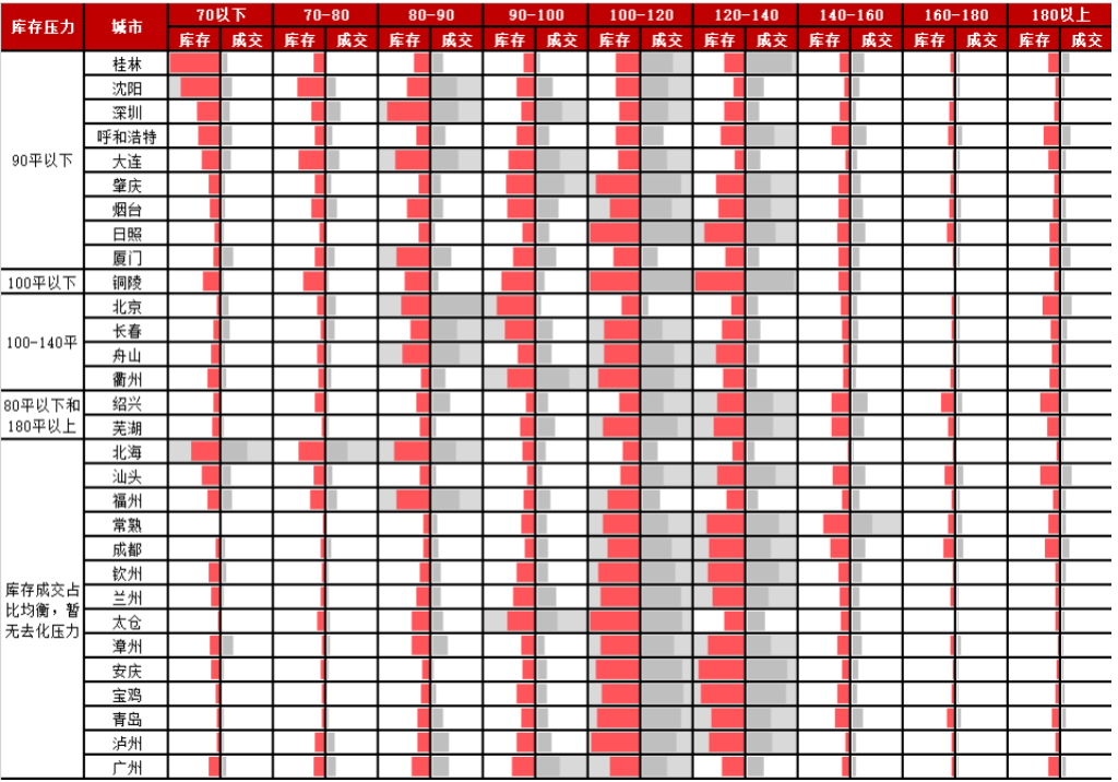 聚焦單個城市,多數高庫存城市各個房型供需關系正常,庫存無明顯積壓現象,少部分城市三房主力戶型庫存不足,其余房型存量過多。
