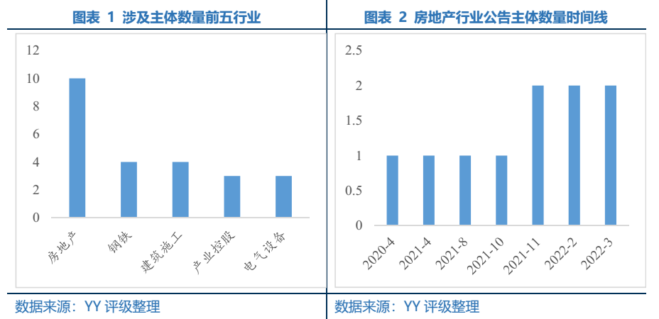 按時間線來看,2021年下半年以來公告集中量較大,涉及主體數量8個。房地產行業曾公告向散戶“關門”主體按公告時間線分別為云南城投、大悅城、恒大、陽光城、奧園、世茂、正榮、融信、龍光、融創,公告后截至目前主體層面出現信用事件涉及的主體數量有6個,主體數量占比60%,分別為恒大、陽光城、奧園、世茂、正榮、龍光,涉及債券數量30個,債券數量占比66.7%。