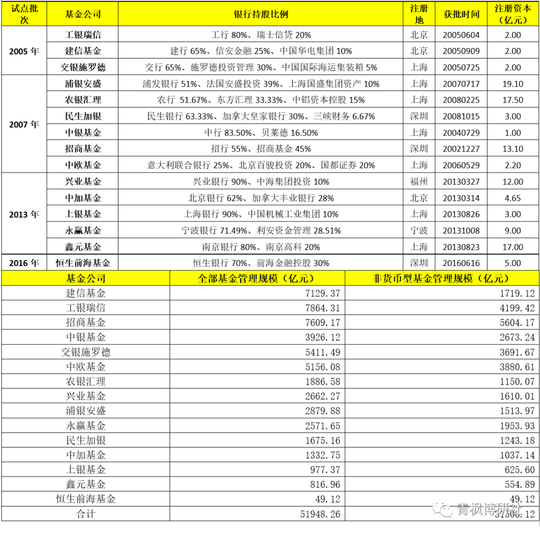 4、2016年,由恒生銀行控股的恒生前海基金在《內(nèi)地與香港關(guān)于建立更緊密經(jīng)貿(mào)關(guān)系的安排》框架下成立,使得我國(guó)銀行系基金公司數(shù)量擴(kuò)容至15家。