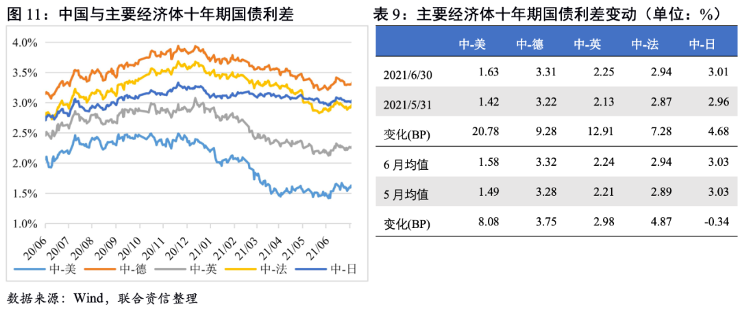 截至6月末,我國與主要經(jīng)濟體的利差較5月末均進(jìn)一步走闊,其中與美國的利差上升幅度最大。6月美國十年期國債收益率整體呈震蕩下行走勢,由1.58%下行至1.45%,主要是由于月初非農(nóng)就業(yè)不及預(yù)期,市場修正對前期經(jīng)濟增長樂觀的預(yù)期。三季度美國經(jīng)濟預(yù)期較為樂觀,同時美聯(lián)儲釋放鷹派信號疊加美國通脹超預(yù)期上行,綜上分析預(yù)計三季度美債收益率有望重回上行渠道,中美十年期國債利差或?qū)⒂兴照3绹猓?月我國與德國、英國和法國的十年期國債利差均值均有所上升,與日本利差則小幅收窄,日本國債利率下行幅度小于我國。