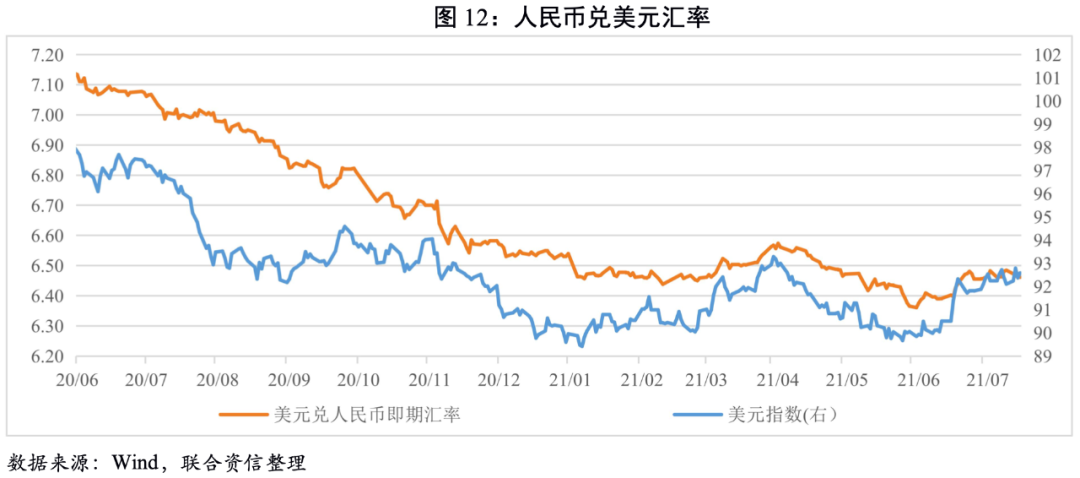 2021年6月,人民幣震蕩貶值,扭轉(zhuǎn)了自二季度以來升值的趨勢。月初美元兌人民幣匯率在6.4左右波動,6月10日之后,美元指數(shù)不斷走高,6月17日美聯(lián)儲會議公布釋放鷹派信號后,美元指數(shù)更是大幅上行,疊加6月15日上調(diào)外匯存款準(zhǔn)備金率,美元指數(shù)的走高帶動人民幣走弱。
