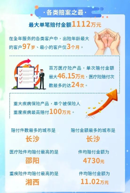 從該公司各類賠案情況看,最大單筆賠付金額1112萬(wàn)元;在全年服務(wù)的各類客戶中,出險(xiǎn)年齡最大的客戶97歲、最小的客戶僅3個(gè)月;百萬(wàn)醫(yī)療險(xiǎn)產(chǎn)品,單次賠付金額最大46.15萬(wàn)元,醫(yī)療險(xiǎn)賠付次數(shù)最多的達(dá)24次;重大疾病保險(xiǎn)產(chǎn)品,單個(gè)被保險(xiǎn)人重度疾病最高賠付 100萬(wàn)元;