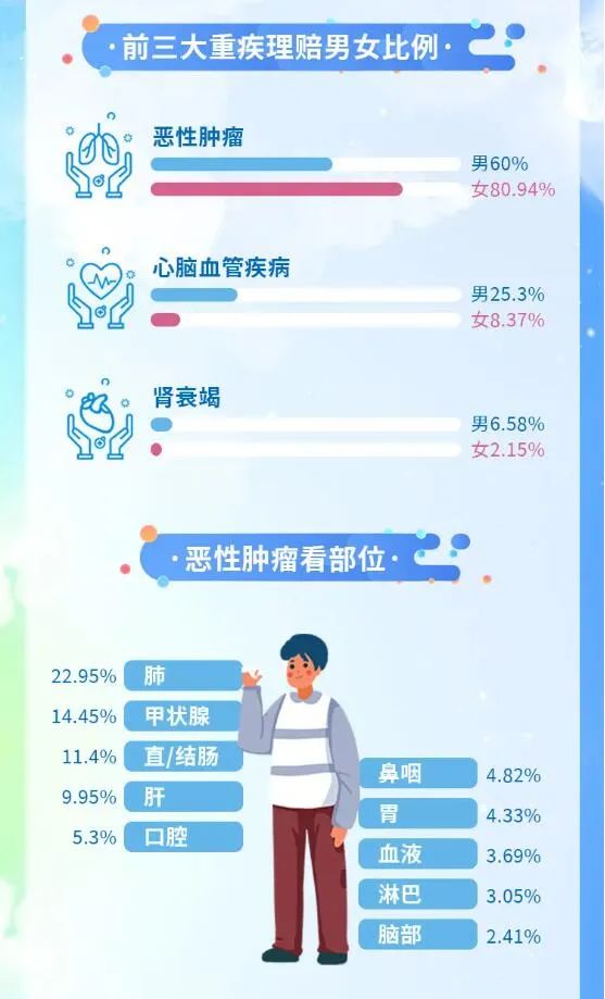 其中,在發(fā)病概率累計(jì)超過(guò)80%的前三大重疾理賠數(shù)據(jù)中:男性患惡性腫瘤的比例為60%,患心腦血管病的比例為25.3%,患腎衰竭的比例為6.58%;女性患惡性腫瘤的比例為80.94%,患心腦血管病的比例為8.37%,患腎衰竭的比例為2.15%;