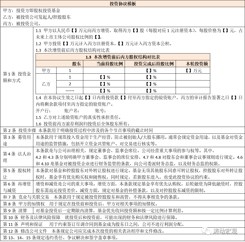 投資協(xié)議的主要條款包括估值條款、退出安排、公司管理安排,防稀釋措施、強(qiáng)制信息披露安排等方面。