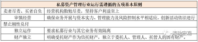 2、明確了賣者盡責(zé)、買者自負(fù);審慎經(jīng)營;禁止剛性兌付;獨(dú)立運(yùn)作以及財(cái)產(chǎn)獨(dú)立等五項(xiàng)基本原則;