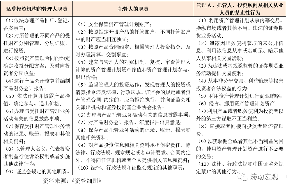 此外《資管細(xì)則》還對(duì)管理人、托管人的職責(zé)以及相關(guān)禁止行為進(jìn)行了明確。