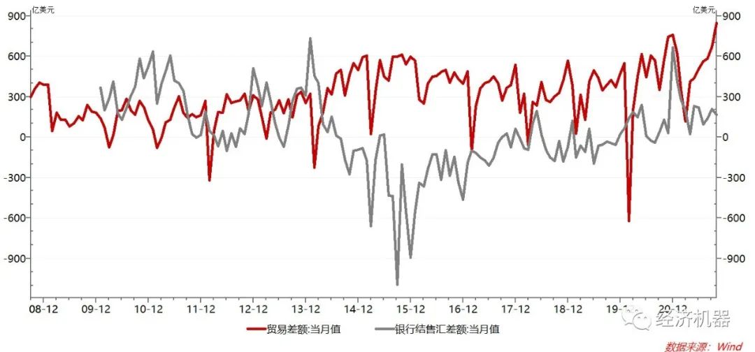 外匯儲備保持“穩定”,直觀原因是銀行結售匯數額遠低于貿易順差。2021年1-10月份,我國銀行結售匯順差為2000億美元,遠低于同期貿易順差5100億美元的水平。鑒于當前外匯管理仍處于非常嚴格狀態,換匯難度較高,企業留存美元的意愿普遍較強。從銀行結售匯看,企業在得到美元后,更愿意選擇留存,以應對不時之需。