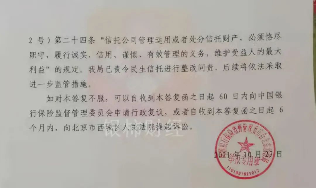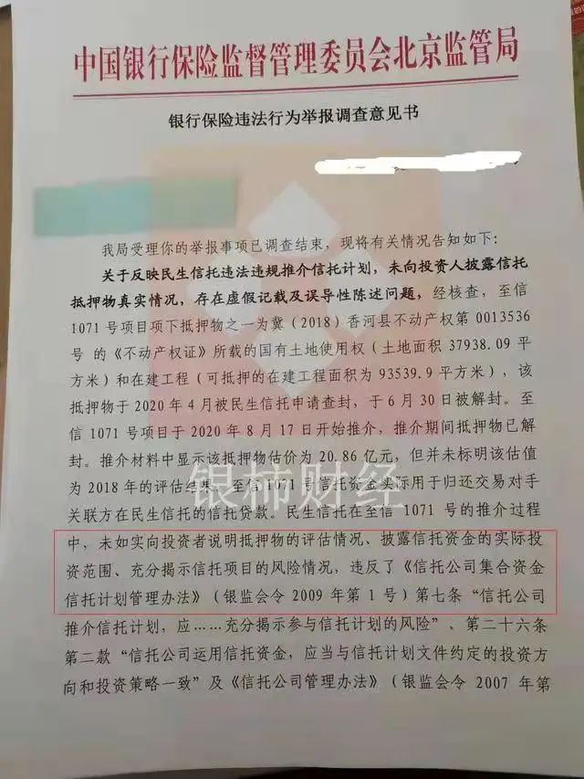 9月份,筆者曾報道過民生信托旗下置信316號出現(xiàn)風(fēng)險的情況,來自北京銀保監(jiān)局出具的《舉報調(diào)查意見書》中顯示,該產(chǎn)品未向投資人進行信息披露,信托資金運用與信托合同定不符等等。并且責(zé)令民生信托進行整改問責(zé),后續(xù)將依法進一步采取行動。