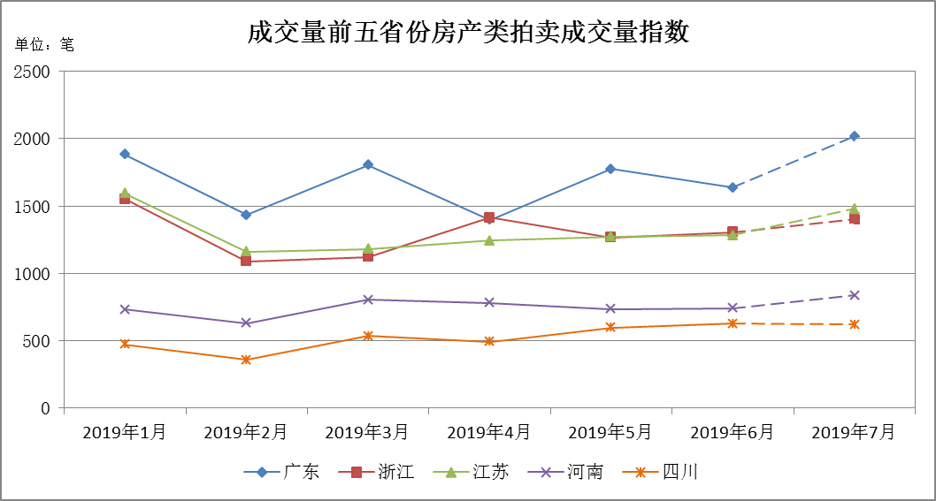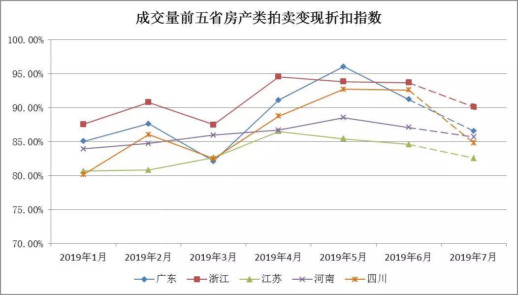 廣東、浙江、江蘇穩(wěn)居房產(chǎn)類拍賣品成交量前三,本月四川省成交量進(jìn)入前五;前五省的成交率指數(shù)與變現(xiàn)折扣指數(shù)均明顯下降,說明前五省的拍賣房產(chǎn)流動(dòng)性與市場(chǎng)投資認(rèn)可度都在降低。