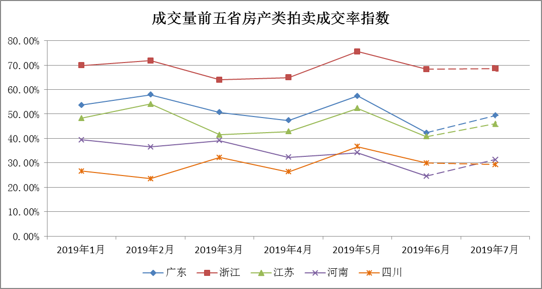 2019年1月至今,前五省的成交率趨勢(shì)較為一致,本月五省的成交率都有所下降,特別是廣東省,下降了近15個(gè)百分點(diǎn)。從今年整體趨勢(shì)來看,成交率從大到小排列依次為浙江、廣東、江蘇、河南、四川,江浙地區(qū)、珠三角地區(qū)經(jīng)濟(jì)發(fā)展水平較高,拍賣市場(chǎng)交易更為開放,拍賣成交的可能性也更大。