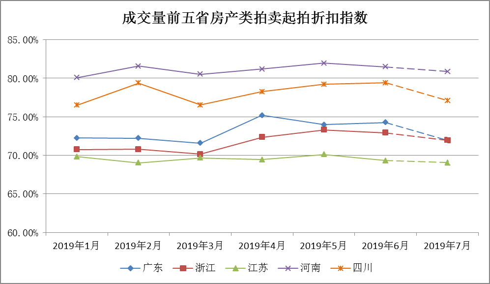 2019年各省房產(chǎn)拍賣起拍折扣指數(shù)的變化趨勢(shì)基本趨同,總體而言起拍折扣指數(shù)范圍在70%~80%左右;河南、四川省的起拍折扣指數(shù)較高,廣東省的起拍折扣指數(shù)波動(dòng)較大,未來五省的起拍折扣指數(shù)均有下降趨勢(shì)。
