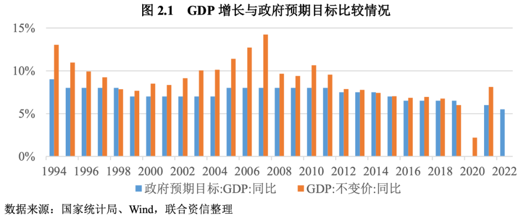 政府工作報告設定2022年經濟增長目標,在去年下調至6%的基礎上,進一步下調至5.5%左右,為近30年來最低增長目標。聯合資信認為,經濟增長目標適度下調,更有利于穩定增長和保證經濟金融安全運行。在宏觀政策的強力托底作用下,部分領域行業的結構性風險或將有序緩釋。