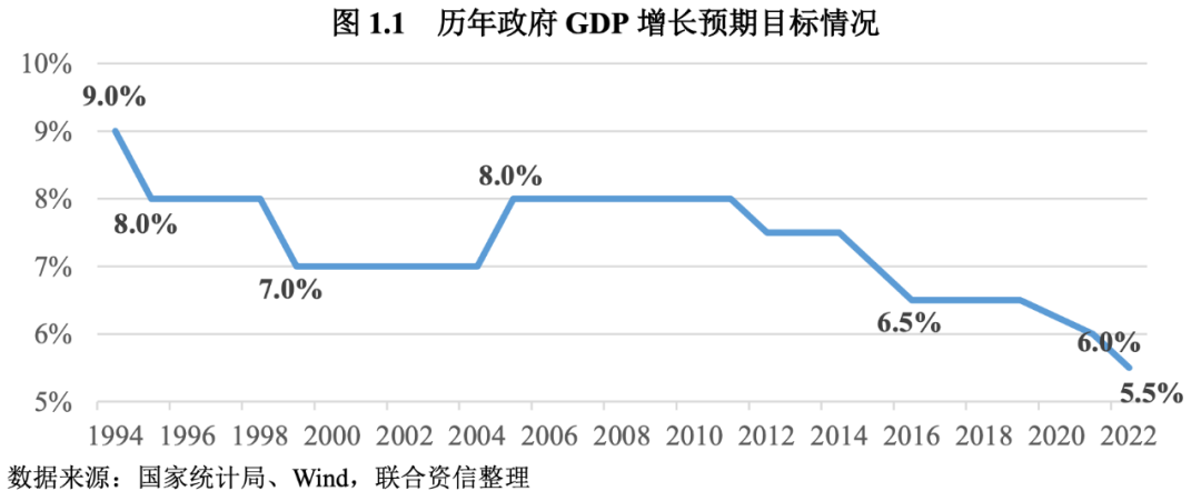 政府報告提出2022年GDP增長5.5%左右的增長目標,是近30年來最低的預期目標。歷史上看,自1994年在年初設定全年經濟增長預期目標以來的近30年里,政府經濟增長目標從最初的9%波動下調到了今年的5.5%,下調了3.5個百分點。其中1995年從上年的9%下調至8%,主要是在經濟過熱,通脹形勢較為嚴重的情況下,國家主動調控降溫經濟。1999年增速下調1個點至7%,則主要是受到亞洲金融危機的影響。唯一一次上調目標發生在2005年:在入世后平穩高速增長的基礎上,為了抓住發展機遇期,實現更快平穩增長,將增長預期目標由原來的7%上調為8%。從2012年到2016年,進入持續的單邊下調階段,增速目標下調了1.5個百分點至6.5%。也正是在這個時期,我國進入“三期疊加”的新發展階段,積極推進結構調整和增長動力轉換,注重生態環境保護和高質量發展。2019年,在供給側結構性改革深入推進和中美貿易摩擦等因素影響下,經濟下行壓力進一步增大,當年將增速目標設定為6%-6.5%。縱觀近30年來增速目標的下調,有些是積極主動的宏觀調控,但更多是在內外部環境壓力下所做的適應性調整。