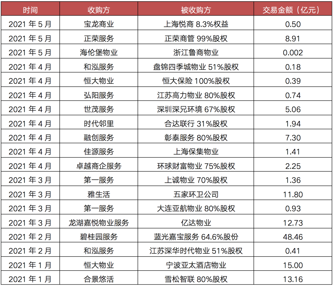 數(shù)據(jù)顯示,2021年以來物管行業(yè)的收并購熱度高漲,中小型收購事件持續(xù)不斷,據(jù)不完全統(tǒng)計(jì),2021年至今物管行業(yè)的收并購事件總交易金額就已經(jīng)接近133億元,超過2020年全年的100億元。