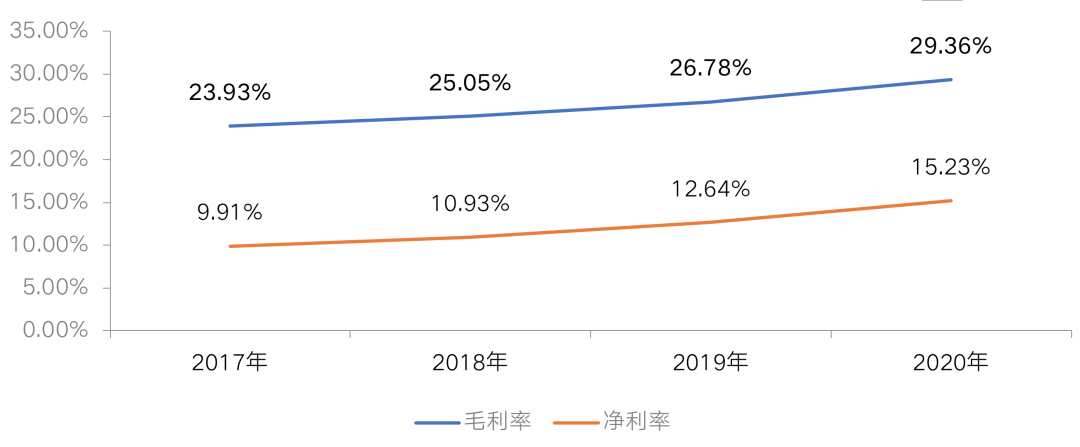 近年來,隨著整個(gè)房地產(chǎn)行業(yè)規(guī)模見頂,相比傳統(tǒng)地產(chǎn)開發(fā),物管行業(yè)現(xiàn)金流穩(wěn)健,經(jīng)營風(fēng)險(xiǎn)相對較低,同時(shí)盈利能力也較為穩(wěn)定。從目前上市的物管企業(yè)2017-2020年的加權(quán)平均毛利率和凈利率來看,近年來物管行業(yè)的毛利率和凈利率都保持著穩(wěn)步上升的態(tài)勢。與此同時(shí),據(jù)CRIC監(jiān)測,2020年典型上市房企的毛利率下降4.8個(gè)百分點(diǎn)至24.3%,凈利率也已下降至10%。
