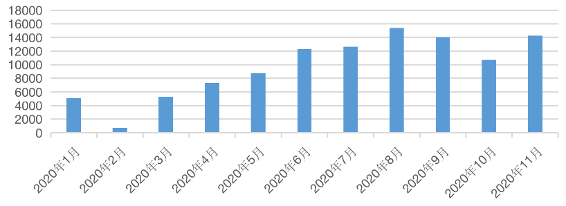 2020年1-11月廣州二手商品住宅成交套數(shù)月度變化