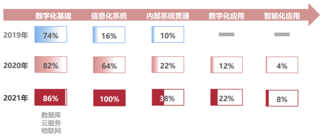 據克而瑞調研顯示,2019到2021的三年間,TOP50房企在數字化轉型方面投入資源與收效都顯著增加。其中,已健全數字化基建(數據庫、云服務和物聯網等數字化轉型基礎設施)整體建設的TOP50房企已接近 90%,且呈逐年上升態勢,內部基礎信息化系統完成比例更是達到了100%。