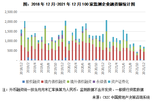 2021年12月100家典型房企的融資總量為702.21億元,環(huán)比下降10%,同比下降48%。房企融資“冰凍”解封雖得以推進(jìn),但當(dāng)前機(jī)構(gòu)融資仍是偏向財(cái)務(wù)狀況較好的房企,12月融資量仍屬于年內(nèi)低位。從融資結(jié)構(gòu)來(lái)看,境內(nèi)債權(quán)融資434.05億元,環(huán)比下降13.5%,同比下降11.1%;境外債權(quán)融資166.52億元,環(huán)比上升35.0%,同比下降58.1%;本月資產(chǎn)證券化融資82.57億元,環(huán)比上升4.9%,同比下降79.6%。而全年來(lái)看,全年融資量13038億元,同比下降26%,近五年來(lái)融資量首次出現(xiàn)負(fù)增長(zhǎng),同時(shí)達(dá)到五年來(lái)最低點(diǎn)。其中,2021下半年以來(lái),受房企商票違約、債券違約等多方面的影響,房企的融資量8月以后均不足千億元。