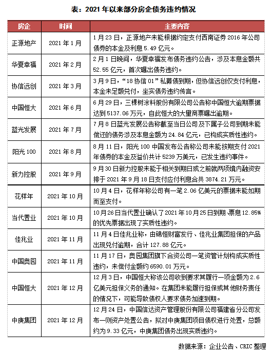 在債務(wù)違約方面, 12月3日,中國(guó)恒大稱其可能無(wú)法履行一項(xiàng)2.6億美元擔(dān)保義務(wù),企業(yè)有可能出現(xiàn)實(shí)質(zhì)性違約。對(duì)此,央行、銀保監(jiān)會(huì)和證監(jiān)會(huì)紛紛表示,恒大出現(xiàn)的風(fēng)險(xiǎn)屬于個(gè)別風(fēng)險(xiǎn),不會(huì)影響中長(zhǎng)期市場(chǎng)的正常融資功能,不會(huì)對(duì)我國(guó)銀行業(yè)、保險(xiǎn)業(yè)的正常運(yùn)行造成任何負(fù)面影響,對(duì)資本市場(chǎng)穩(wěn)定運(yùn)行的外溢影響也是可控的。此后在12月24日,信達(dá)資管宣布擬對(duì)中庚集團(tuán)項(xiàng)目債權(quán)進(jìn)行處置,總額約為9.33億元,意味著中庚集團(tuán)也陷入了債務(wù)實(shí)質(zhì)性違約,房企的流動(dòng)性危機(jī)仍在持續(xù),未來(lái)仍有可能曝出更多的債務(wù)違約事件。