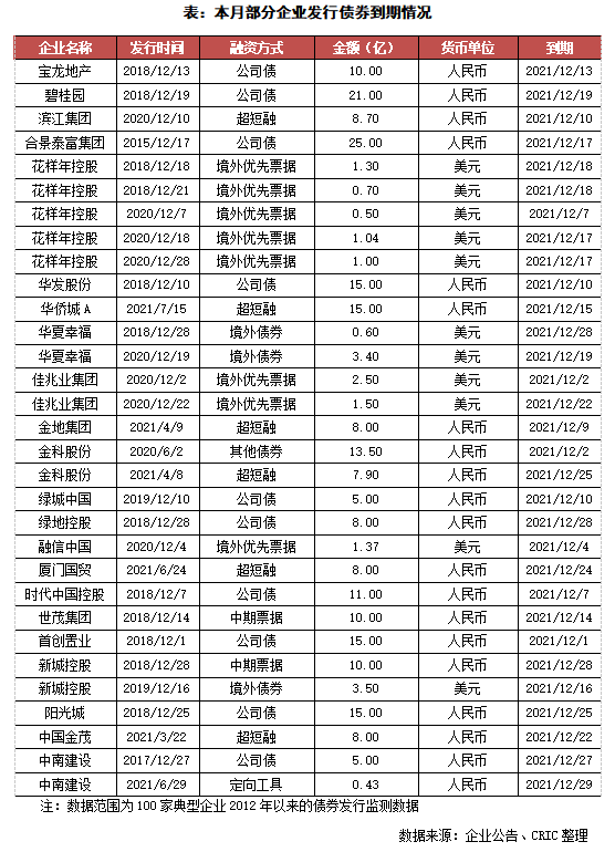 提前關(guān)注到2022年1月將有42筆債券到期,合計(jì)768.03億元,環(huán)比上升128.8%,償債壓力相對(duì)較大,主要由于1月一般是房企的償債高峰期。單筆金額最高為中國(guó)恒大2020年發(fā)行的一筆19.99億美元的境外優(yōu)先票據(jù)。