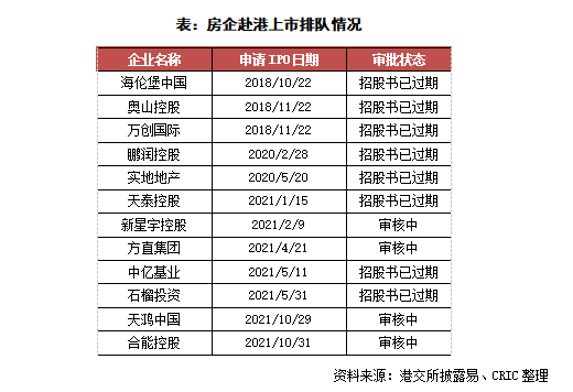 本月沒(méi)有新增房企向港交所遞交招股說(shuō)明書(shū),因此截至2021年底,在港交所在遞交過(guò)招股書(shū)但仍未成功上市的房企仍為12家,其中有8家房企在招股書(shū)過(guò)期后都沒(méi)有更新招股書(shū),未來(lái)是否會(huì)繼續(xù)上市進(jìn)程還有待觀察。