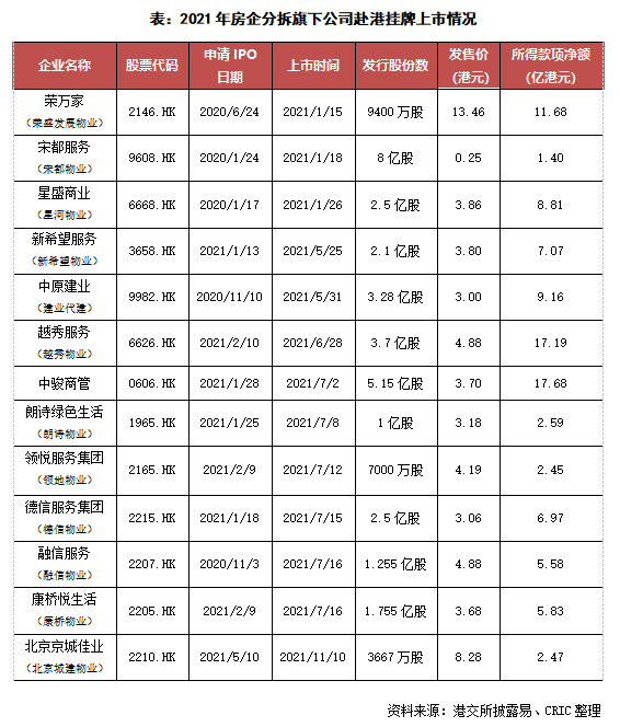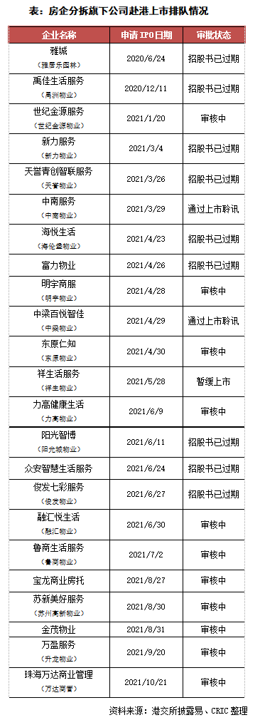 本月沒(méi)有房企完成上市,因此2021年全年新上市的房企僅有三巽控股一家。不過(guò)本月在房企旗下公司方面則有德商置業(yè)旗下的物業(yè)公司德商產(chǎn)投服務(wù)在17日完成了上市,其IPO發(fā)售價(jià)為1.11港元/股,所得IPO凈額為1.28億港元,。因此2021年新上市的房企旗下公司增至14家,不過(guò)近兩個(gè)月遞交上市申請(qǐng)的房企旗下公司數(shù)量明顯減少,港交所對(duì)于已交表的企業(yè)的審核也較為嚴(yán)格,房企旗下公司的上市速度有所減緩。除此之外,由于2022年開(kāi)始港交所對(duì)上市企業(yè)基礎(chǔ)盈利門檻提高的60%新規(guī)將正式施行,規(guī)模較小的房企旗下公司的上市將會(huì)越發(fā)艱難,未來(lái)是否還會(huì)出現(xiàn)上市潮還有待觀察。