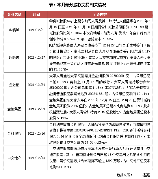 本月有多家房企出現(xiàn)了股東減持,包括華僑城、陽(yáng)光城、金融街等,在當(dāng)前房地產(chǎn)流動(dòng)性危機(jī)的背景下,部分進(jìn)行財(cái)務(wù)投資的股東開(kāi)始考慮撤離房地產(chǎn)行業(yè)。除此之外,本月金科為旗下服務(wù)引入了博裕投資作為戰(zhàn)略投資者,以37.34億港元的價(jià)格轉(zhuǎn)讓了22%的股權(quán),一定程度上優(yōu)化了企業(yè)的流動(dòng)性,同時(shí)也為金科服務(wù)的發(fā)展帶來(lái)了戰(zhàn)略合作機(jī)會(huì),有助于促進(jìn)金科服務(wù)長(zhǎng)期健康發(fā)展。