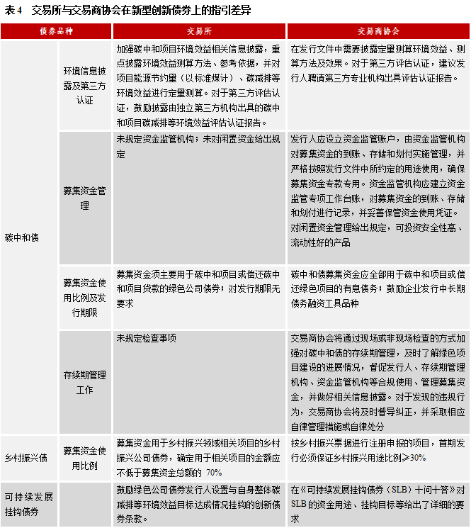 今年,交易商協(xié)會接連推出碳中和債、鄉(xiāng)村振興債、可持續(xù)發(fā)展掛鉤債券,進(jìn)一步提升了金融服務(wù)綠色發(fā)展和鄉(xiāng)村振興的戰(zhàn)略能力,在交易所修訂2021年版發(fā)行指引后,二者在創(chuàng)新債券項(xiàng)目上實(shí)現(xiàn)了一致。但是在募集資金管理、資金使用比例和存續(xù)期管理上有部分差異。