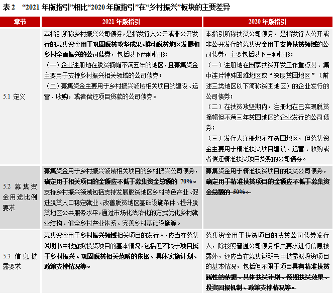 2021年版指引主要修訂以下內(nèi)容:一是給出鄉(xiāng)村振興公司債券的發(fā)行要求,即企業(yè)注冊地在脫貧摘帽不滿五年的地區(qū),且募集資金主要用于支持鄉(xiāng)村振興相關(guān)領(lǐng)域的公司債券,或主要用于鄉(xiāng)村振興領(lǐng)域相關(guān)項(xiàng)目的建設(shè)、運(yùn)營、收購,或者償還項(xiàng)目貸款的公司債券;二是提升資金使用比例,確定用于相關(guān)項(xiàng)目的金額應(yīng)不低于募集資金總額的 70%,較扶貧債券使用比例提升20%;三是明確資金使用范圍,鄉(xiāng)村振興債應(yīng)支持發(fā)展脫貧地區(qū)鄉(xiāng)村特色產(chǎn)業(yè)、促進(jìn)脫貧人口穩(wěn)定就業(yè)、改善脫貧地區(qū)基礎(chǔ)設(shè)施條件、提升脫貧地區(qū)公共服務(wù)水平,通過市場化法治化的方式優(yōu)化鄉(xiāng)村就業(yè)結(jié)構(gòu)、健全鄉(xiāng)村產(chǎn)業(yè)體系、完善鄉(xiāng)村基礎(chǔ)設(shè)施等。