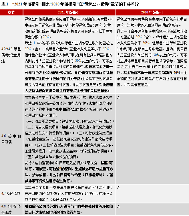 與2020年版指引相比,新版指引主要是強(qiáng)化約束綠色債券募集資金用途,新增“碳中和綠色債券”、“藍(lán)色債券”、“鄉(xiāng)村振興公司債”等債券品種的發(fā)行規(guī)則,同時(shí)修訂了對應(yīng)債券品種的監(jiān)管要求。