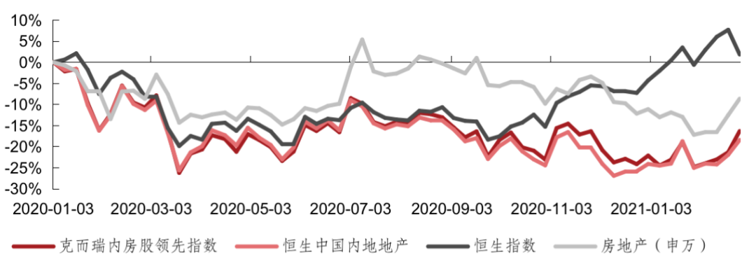 備注:1)恒生中國內地地產指數的推出主要是為了反映前10只市值最大、流通性最高,在香港上市但主要營業收入來自中國內地的房地產股票表現。當前成分股共10只,分別為:中國金茂、中國海外發展、世茂集團、龍湖集團、華潤置地、龍光集團、碧桂園、中國恒大、碧桂園服務、融創中國