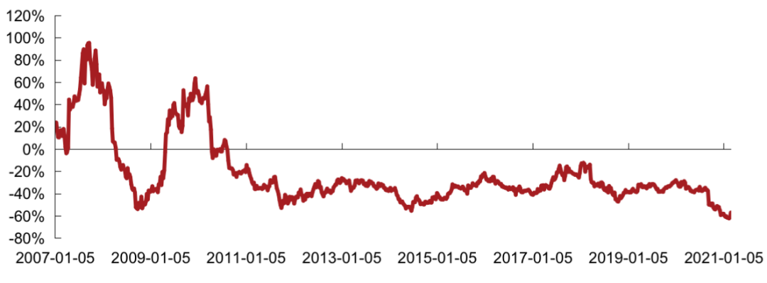 2021年2月克而瑞內房股領先指數估值平穩,大盤走勢上行,指數相對恒指PE繼續走低。2021年2月相對恒指成分股的PE周均值為-60.4%,低于上月相對PE周均值-60.0%,低于2020年全年相對PE周均值-40.2%。