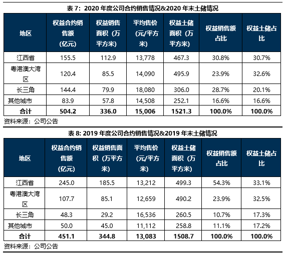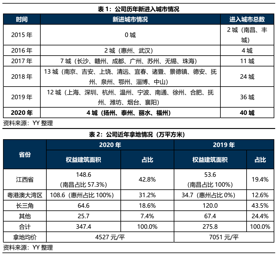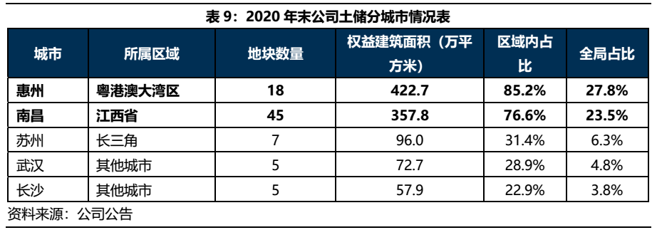 這一戰略布局在公司經營中體現較為明顯。公司一改2018-2019年度對外攻城略地的表現,2020年新進入城市僅4座;公司2020年度拿地情況較上年變化明顯,整體看,對江西省下沉更加顯著,江西省內南昌以外地區占比增加,而對粵港澳、其他地區風險偏好較低,主要集中于較早進入深耕的惠州以及其他省會城市,江西省、長三角、粵港澳以外的地區占比下降明顯。從拿地均價上看,2020年拿地整體相比2019年較為下沉。