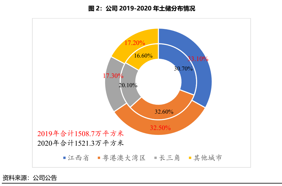 從土儲分布看,截至2020年末,公司權益口徑土儲規模達1,521.3萬平方米,公司主要經營的江西省、粵港澳大灣區、長三角、其他城市的權益口徑土儲分布較為均勻,2019-2020年比例變化不大。